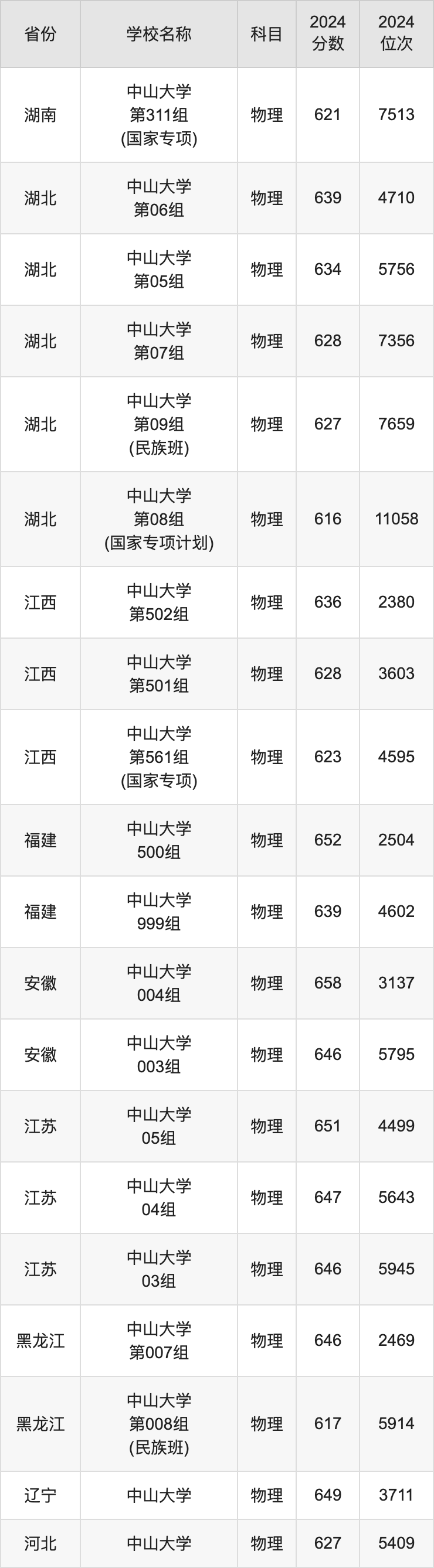 中山大学2024年有7个专业组面向广东省内首选了物理科目的考生招生,219组的收分最高,分数线达643分,选科要求是化学,招生专业包含计算机类、人工智能、软件工程、网络空间安全。221组的录取分数线最低,2024年为624分,选科要求是化学,招生专业包含化学类、地理科学类、生物科学类、基础医学、法医学、预防医学、药学、生物技术、生态学。