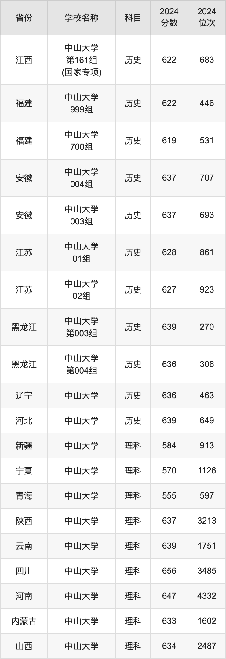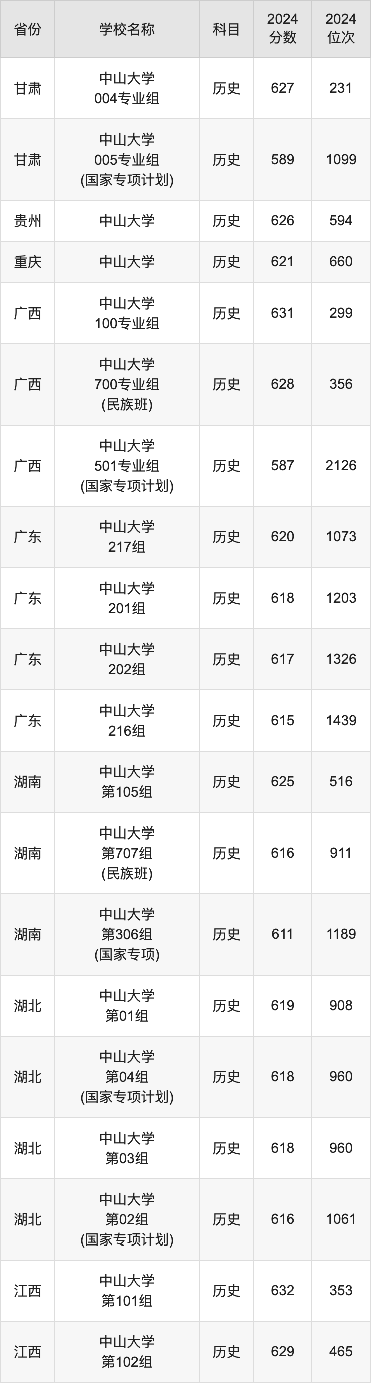中山大学2024年有4个专业组面向广东省内首选了历史科目的考生招生,217组的收分最高,分数线达620分,选科要求是不限,招生专业包含经济学类、工商管理类、旅游管理类、经济学、工商管理。216组的录取分数线最低,2024年为615分,选科要求是不限,招生专业包含社会学类、外国语言文学类、法学、新闻传播学类、图书情报与档案管理类。
