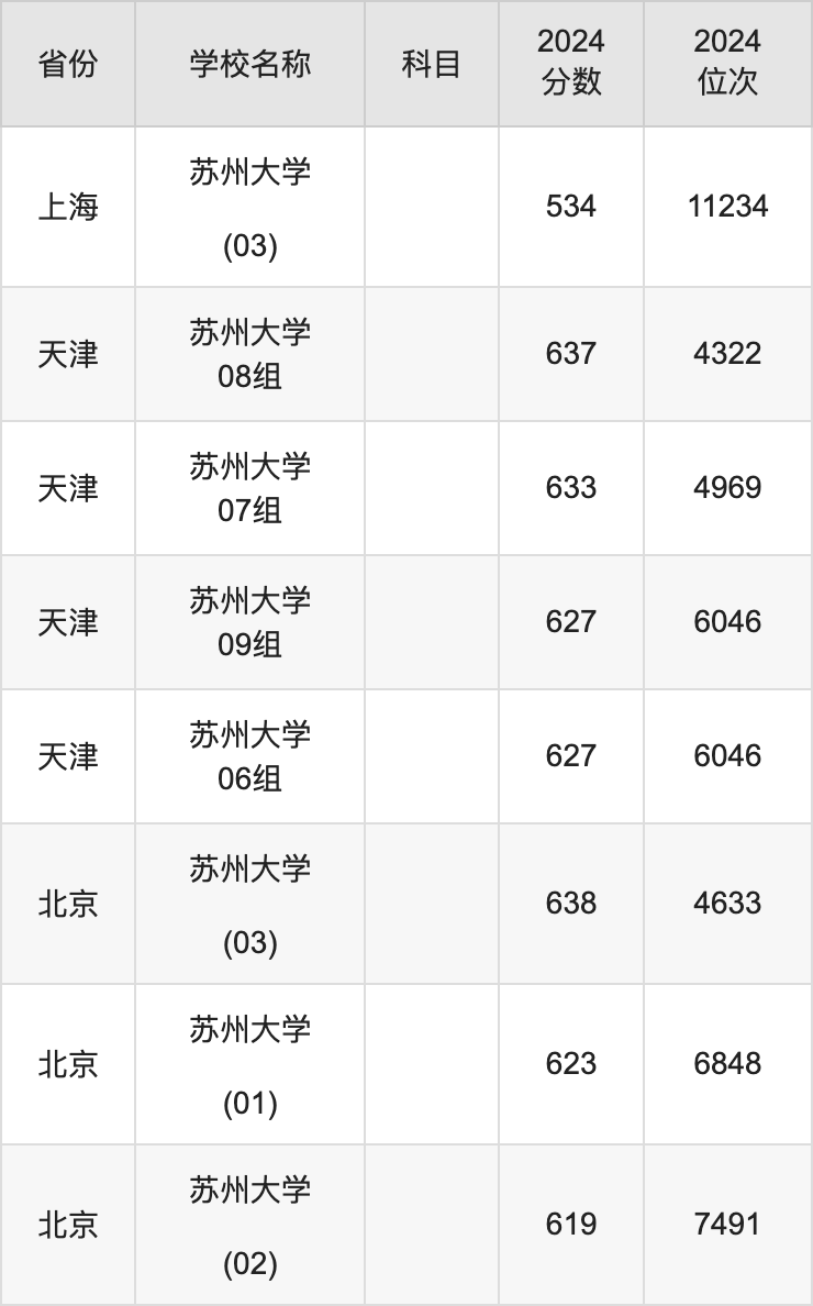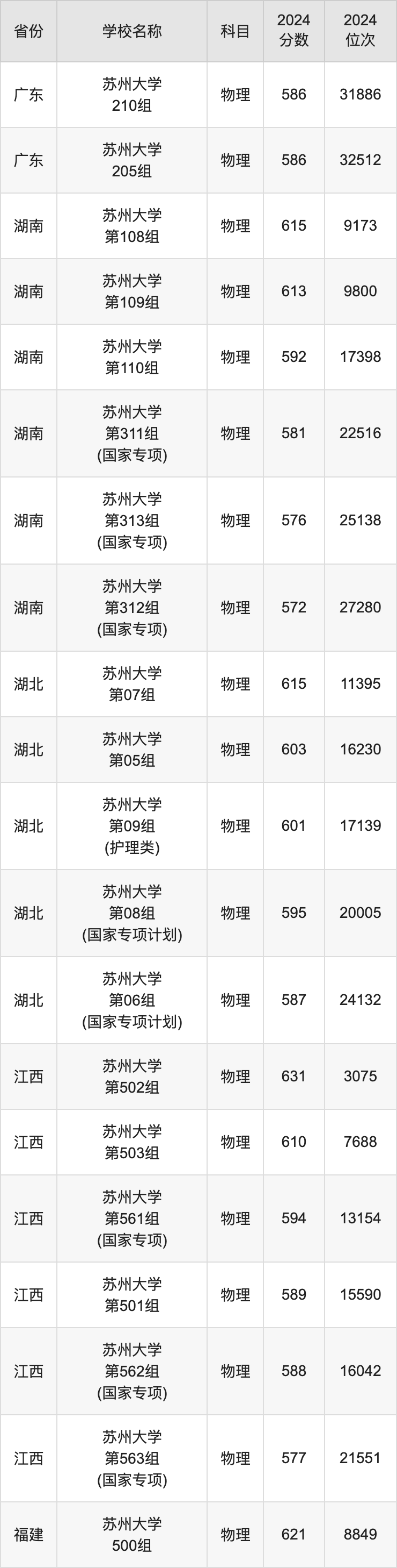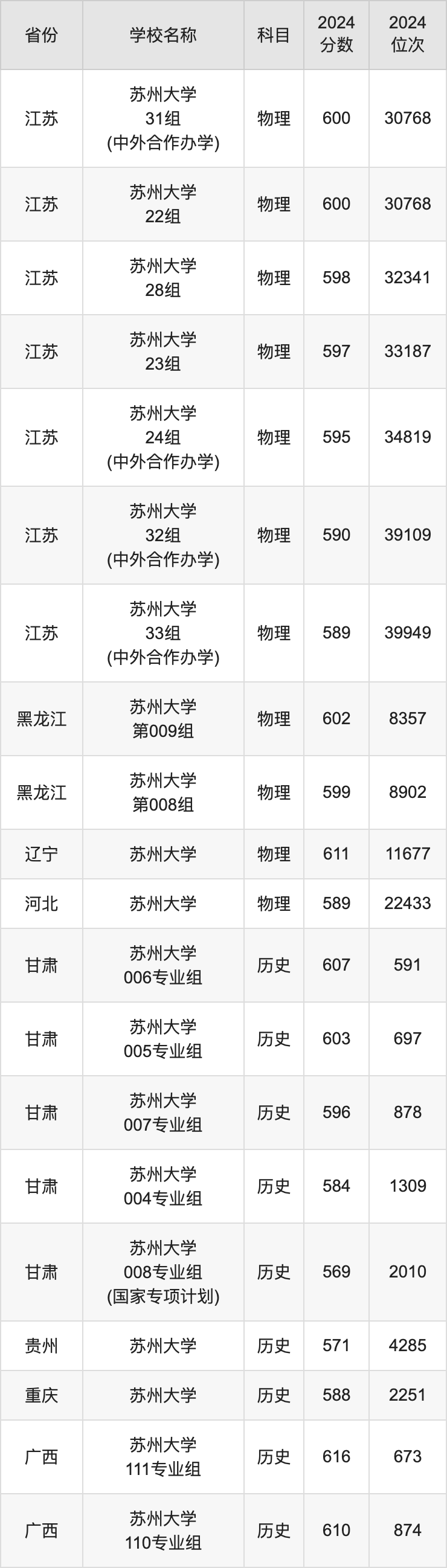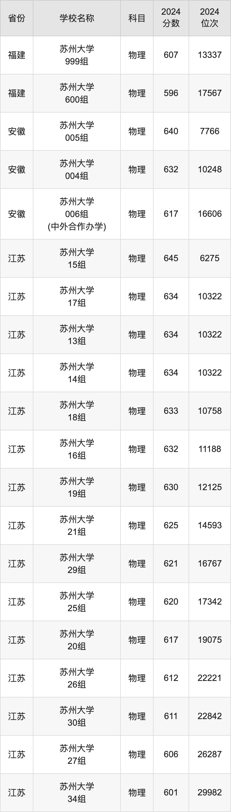 苏州大学2024年有22个专业组面向江苏省内首选了物理科目的考生招生,15组的收分最高,分数线达645分,选科要求是化学,招生专业包含临床医学。33组(中外合作)的录取分数线最低,2024年为589分,选科要求是化学,招生专业包含药学。