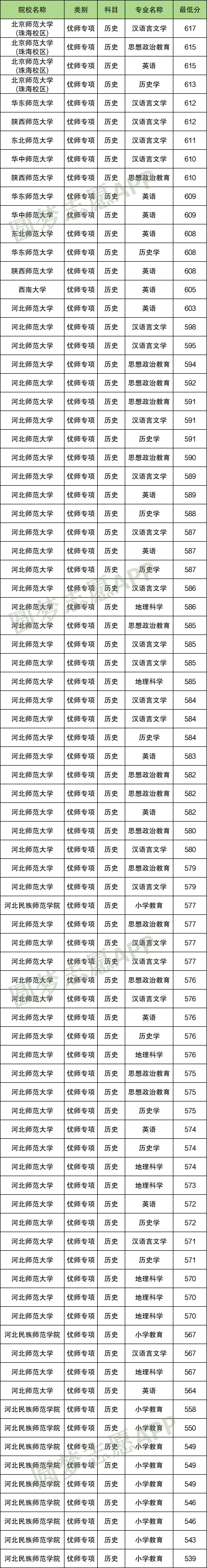 2024年优师专项计划大学历史类最低录取分数线是539分,最好考的学校是河北民族师范学院,招生专业为小学教育;分数线最高的优师专项计划大学是北京师范大学(珠海校区)617分,招生专业为汉语言文学。