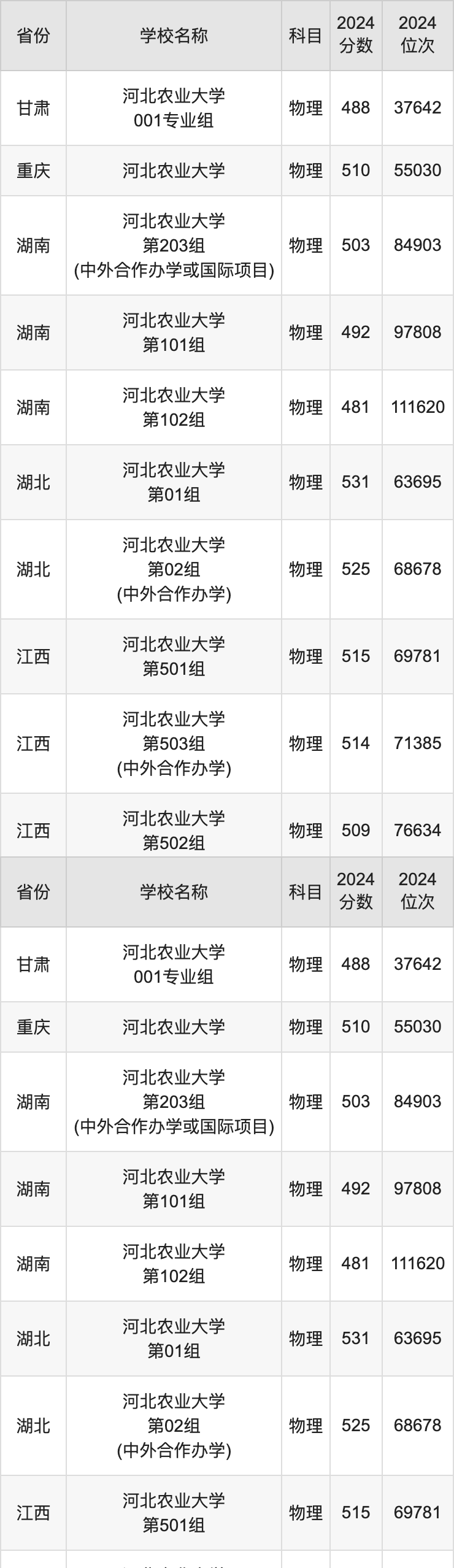 河北农业大学2024年面向河北省内首选了物理科目的考生招生,分数线达504分,招生专业包含经济学、经济统计学、金融学、国际经济与贸易、法学、汉语言文学、外国语言文学类、数学与应用数学、应用物理学、化学。