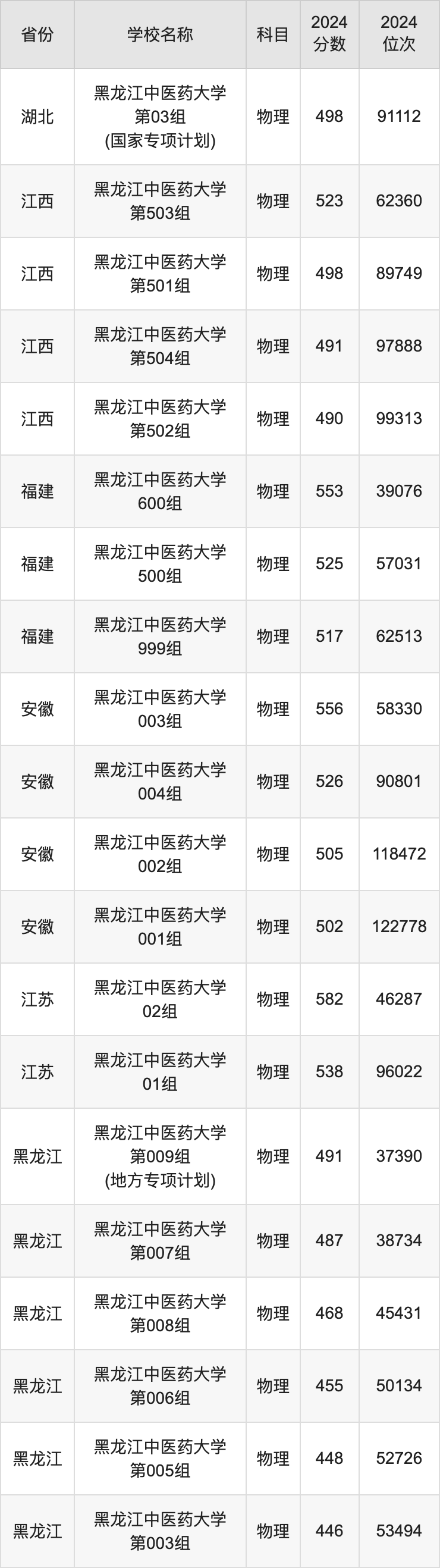 黑龙江中医药大学2024年有8个专业组面向黑龙江省内首选了物理科目的考生招生,第009组(地方专项)的收分最高,分数线达491分,选科要求是生物,招生专业包含中西医临床医学。第002组的录取分数线最低,2024年为443分,选科要求是化学,招生专业包含中药制药、医学检验技术、医学实验技术、康复治疗学。