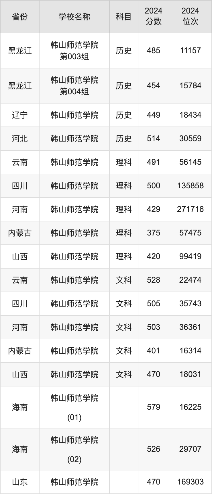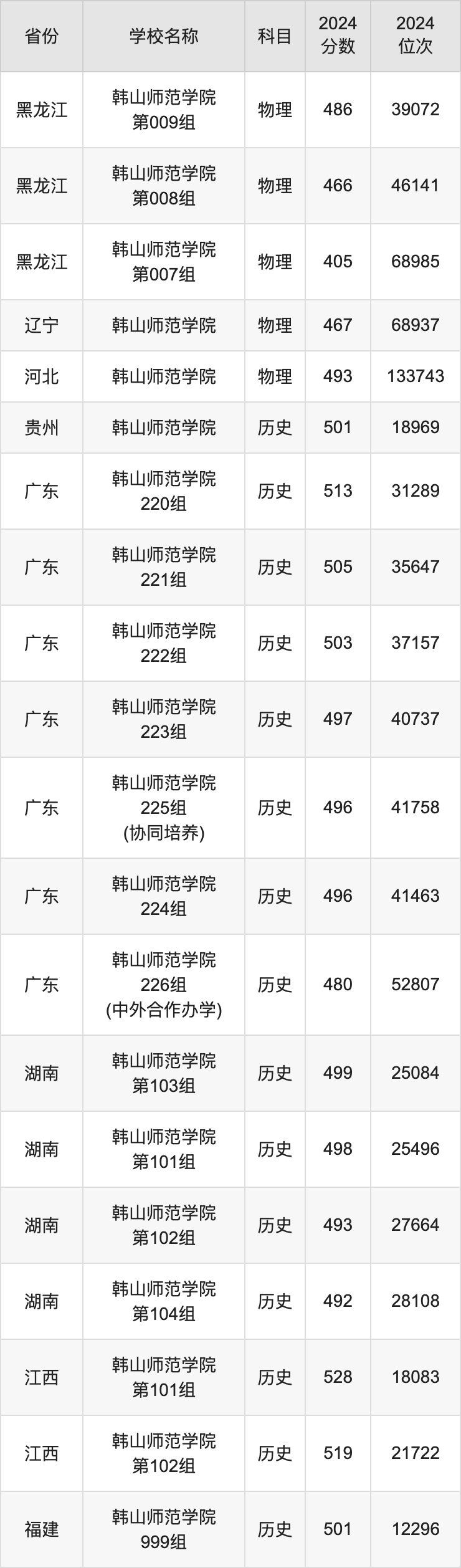 韩山师范学院2024年有18个专业组面向广东省内首选了历史科目的考生招生,220组的收分最高,分数线达513分,选科要求是政治,招生专业包含思想政治教育。226组(中外合作)的录取分数线最低,2024年为480分,选科要求是不限,招生专业包含学前教育。