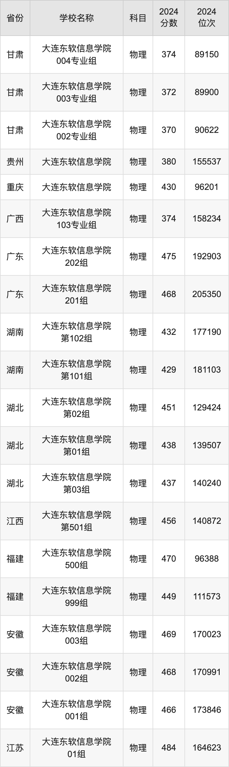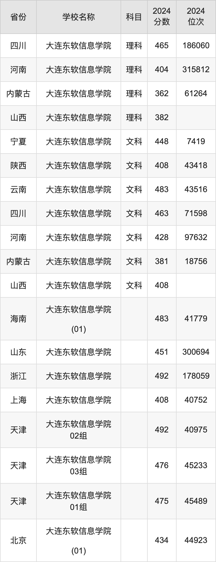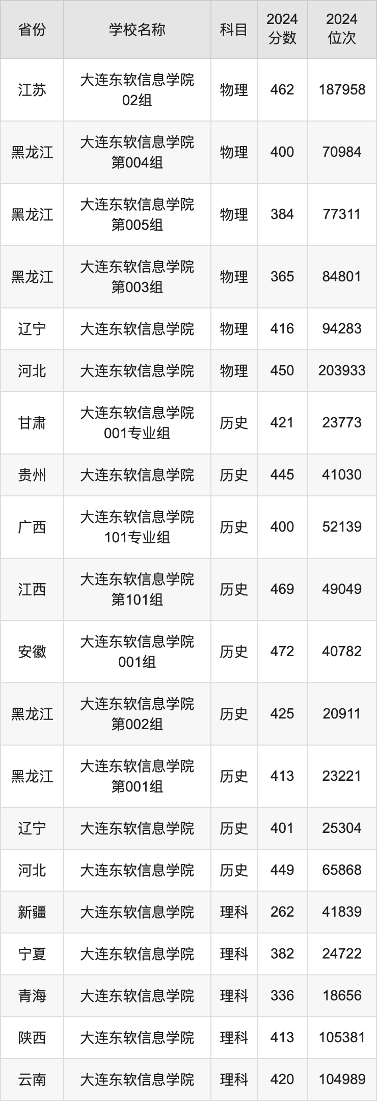 大连东软信息学院2024年面向辽宁省内首选了历史科目的考生招生,分数线达401分,招生专业包含计算机应用技术、软件技术、电子商务、虚拟现实技术应用、人工智能技术应用、大数据技术、财务管理、人力资源管理、英语、日语。