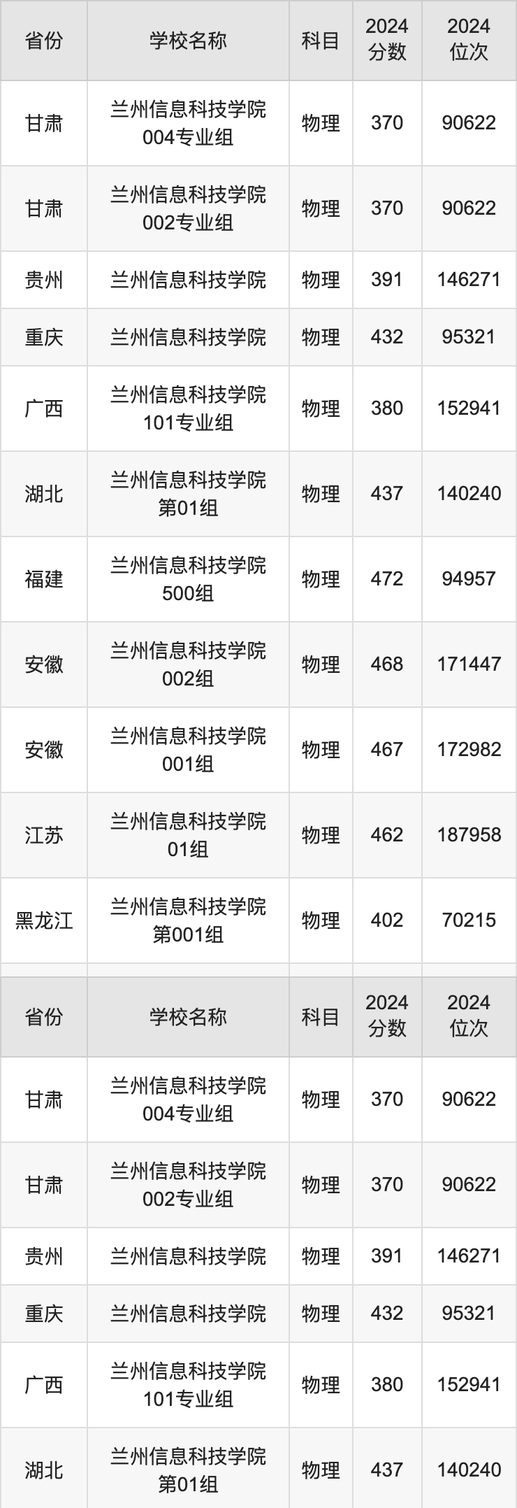 兰州信息科技学院2024年有2个专业组面向甘肃省内首选了物理科目的考生招生,004组的收分最高,分数线达370分,选科要求是化学,招生专业包含机械设计制造及其自动化、机器人工程、新能源汽车工程、机械电子工程、智能制造工程、能源与动力工程、电气工程及其自动化、智能电网信息工程、自动化、人工智能。004组的录取分数线最低,2024年为370分,选科要求是化学,招生专业包含机械设计制造及其自动化、机器人工程、新能源汽车工程、机械电子工程、智能制造工程、能源与动力工程、电气工程及其自动化、智能电网信息工程、自动化、人工智能。