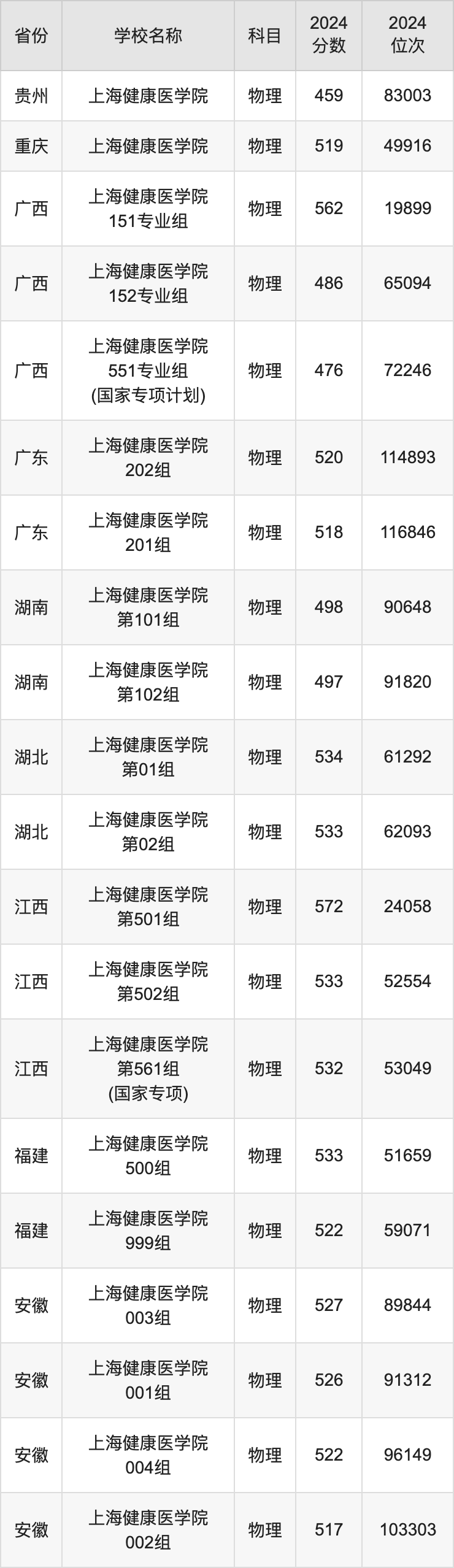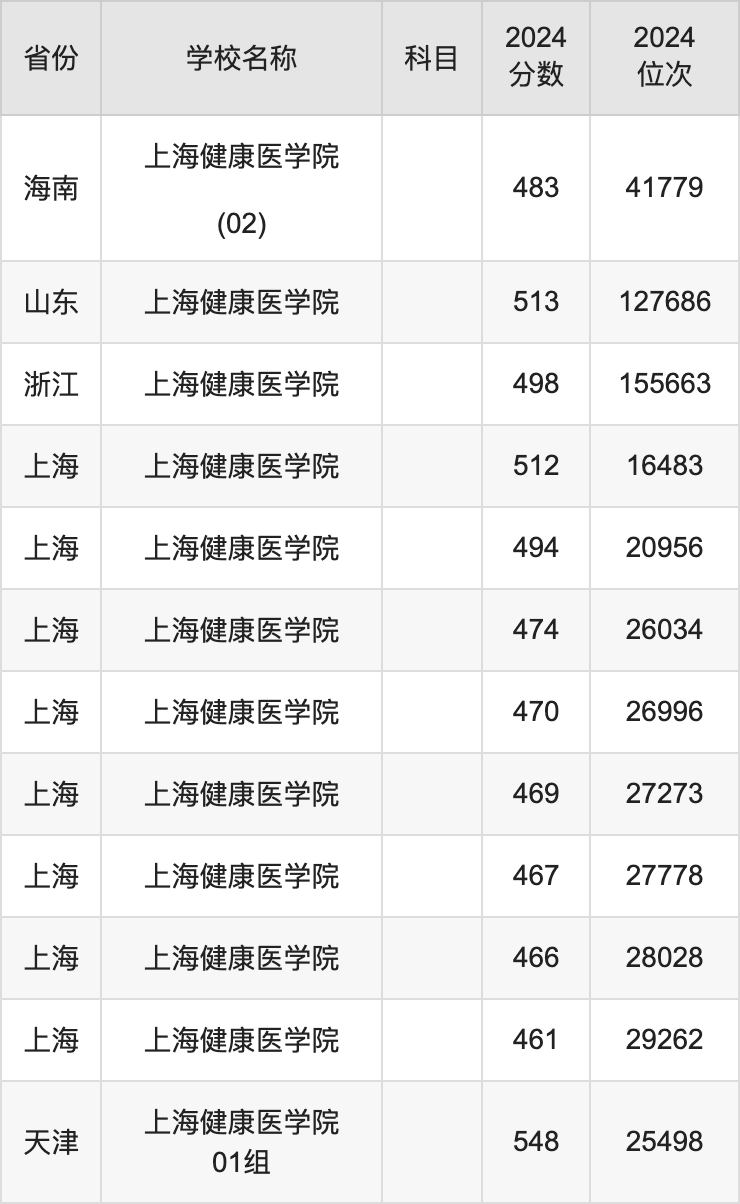 上海健康医学院2024年有8个专业组面向上海市内的考生招生,01组的收分最高,分数线达512分,选科要求是物理和化学,招生专业包含临床医学。07组的录取分数线最低,2024年为461分,选科要求是化学,招生专业包含助产学。