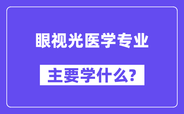 眼视光医学专业的主要课程有:《系统解剖学》、《组织学与胚胎学》、《生理学》、《生物化学与分子生物学》、《病理学》、《病理生理学》、《药理学》、《诊断学》、《内科学》、《外科学》、《妇产科学》、《儿科学》、《眼科学基础》、《眼病学》、《视光学理论和方法》、《眼视光应用光学》、《眼视光公共卫生学》、《视觉神经生理学》、《双眼视觉学》、《眼镜学》、《角膜接触镜学》、《屈光手术学》、《低视力学》、《斜视弱视学》、《眼视光器械学》等。