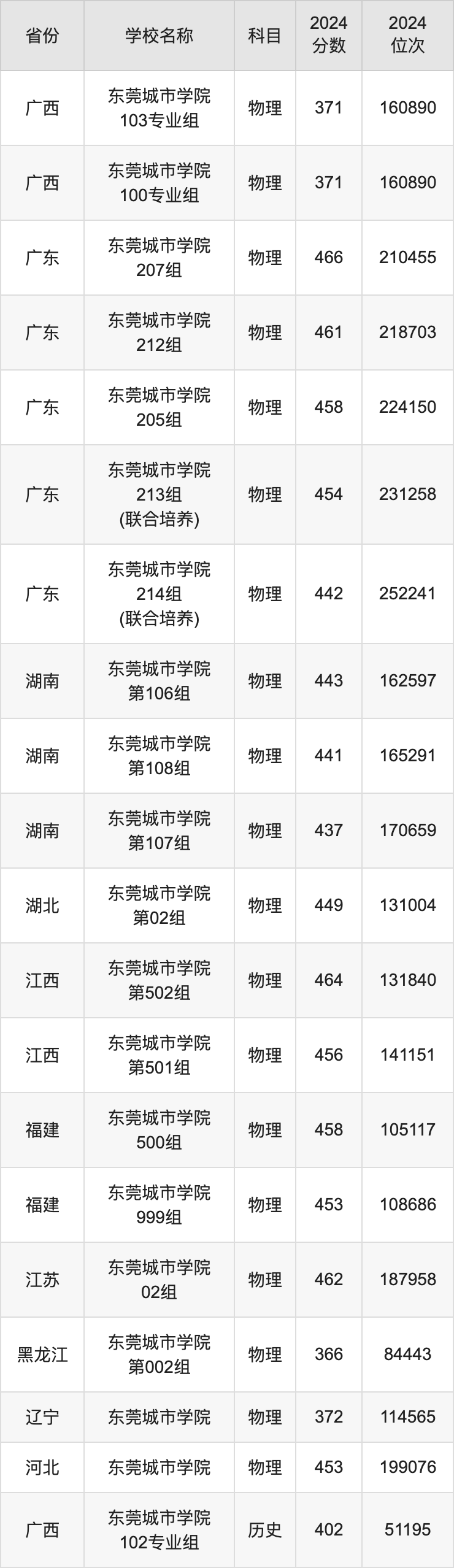 东莞城市学院2024年有5个专业组面向广东省内首选了物理科目的考生招生,207组的收分最高,分数线达466分,选科要求是地理,招生专业包含人文地理与城乡规划。214组(联合培养)的录取分数线最低,2024年为442分,选科要求是化学,招生专业包含软件工程。