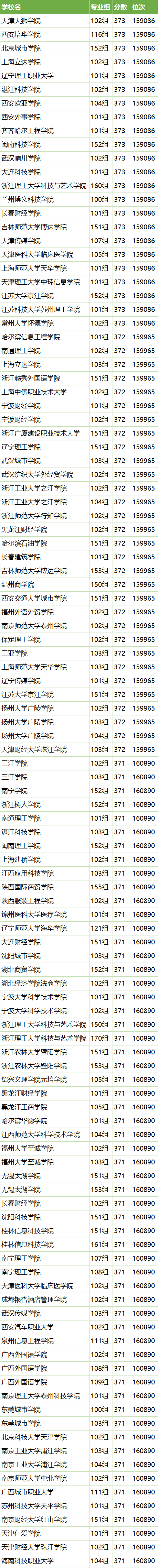(2)373分:天津传媒学院、长春财经学院、大连科技学院、武汉晴川学院、闽南科技学院、西安外事学院、西安欧亚学院、上海立达学院、辽宁理工职业大学、天津天狮学院,最低录取位次为第159086名;