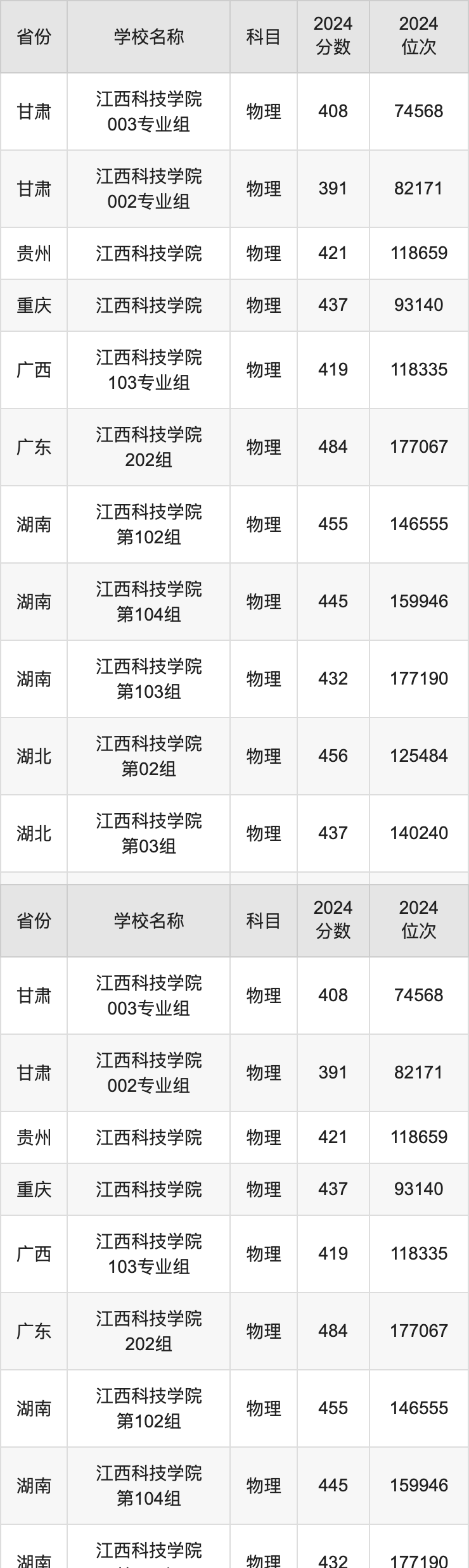 江西科技学院2024年有5个专业组面向江西省内首选了物理科目的考生招生,第501组的收分最高,分数线达471分,选科要求是不限,招生专业包含工商管理、电子商务、会计学、财务管理、国际经济与贸易、商务英语、网络与新媒体、小学教育、教育学。第504组的录取分数线最低,2024年为450分,选科要求是政治,招生专业包含大数据管理与应用、金融工程。