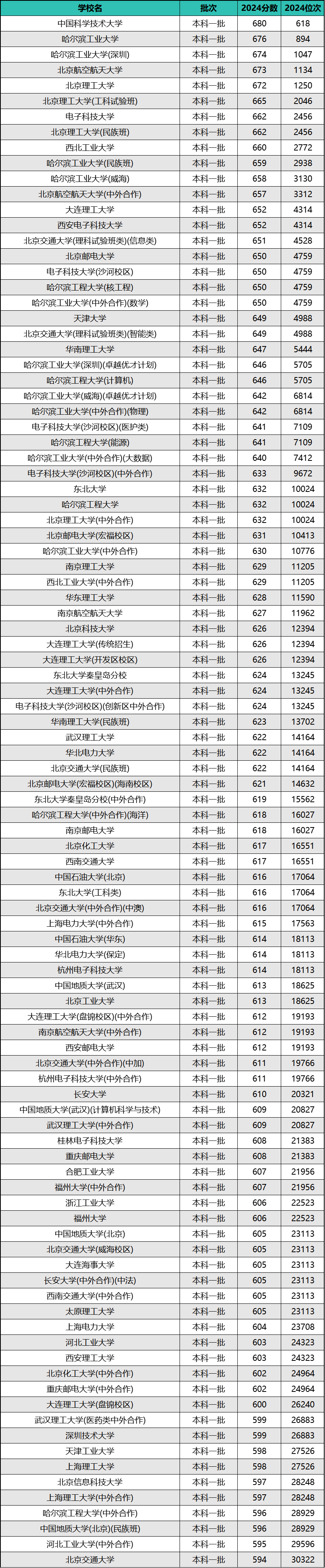下图是2024年四川理科中录取分数线最高的前100所理工类院校名单: