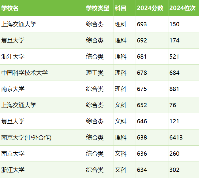 (2)650-680分:上海交通大学(文科)、南京大学(理科)、中国科学技术大学(理科),文科最低录取位次为第76名,理科最低录取位次为第881名;