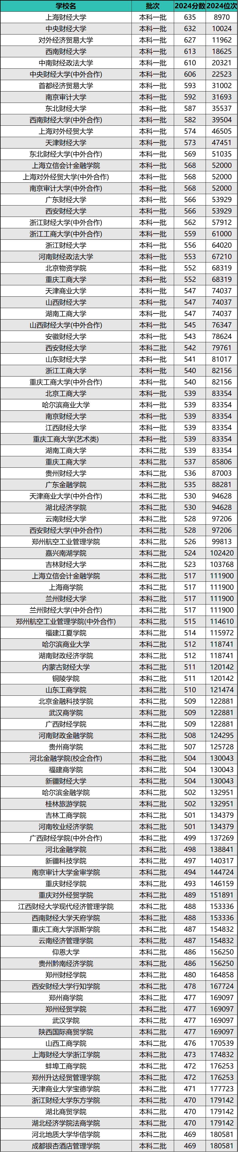 二、2024各大财经类院校录取分数线