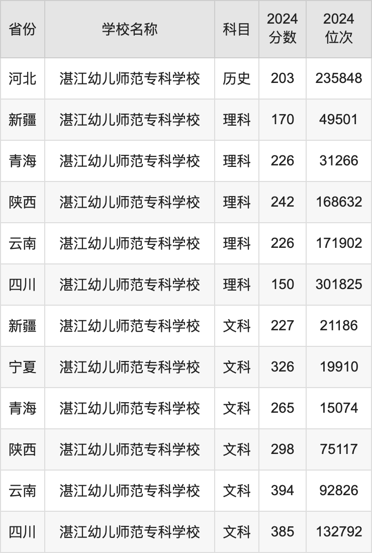 2024年湛江幼儿师范专科学校在全国各省专科的最低录取分数线在150~394分之间。河北物理类高考生最低366分能上湛江幼儿师范专科学校、广东物理类高考生最低358分能上湛江幼儿师范专科学校……下文将展示湛江幼儿师范专科学校在全国18个高考省份中的专科最低投档录取分汇总!