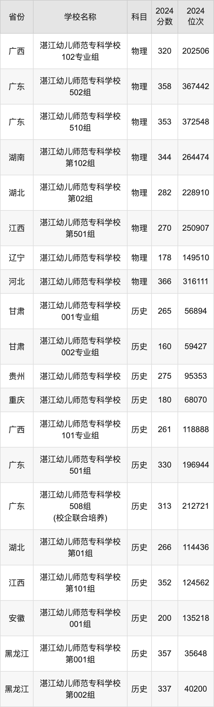 可见,湛江幼儿师范专科学校的不同专业组,在“招生专业、录取分数线”等方面有较大区别。物理类专业组之间的分数线差距高达5分、历史类专业组之间的分数线差距高达17分。