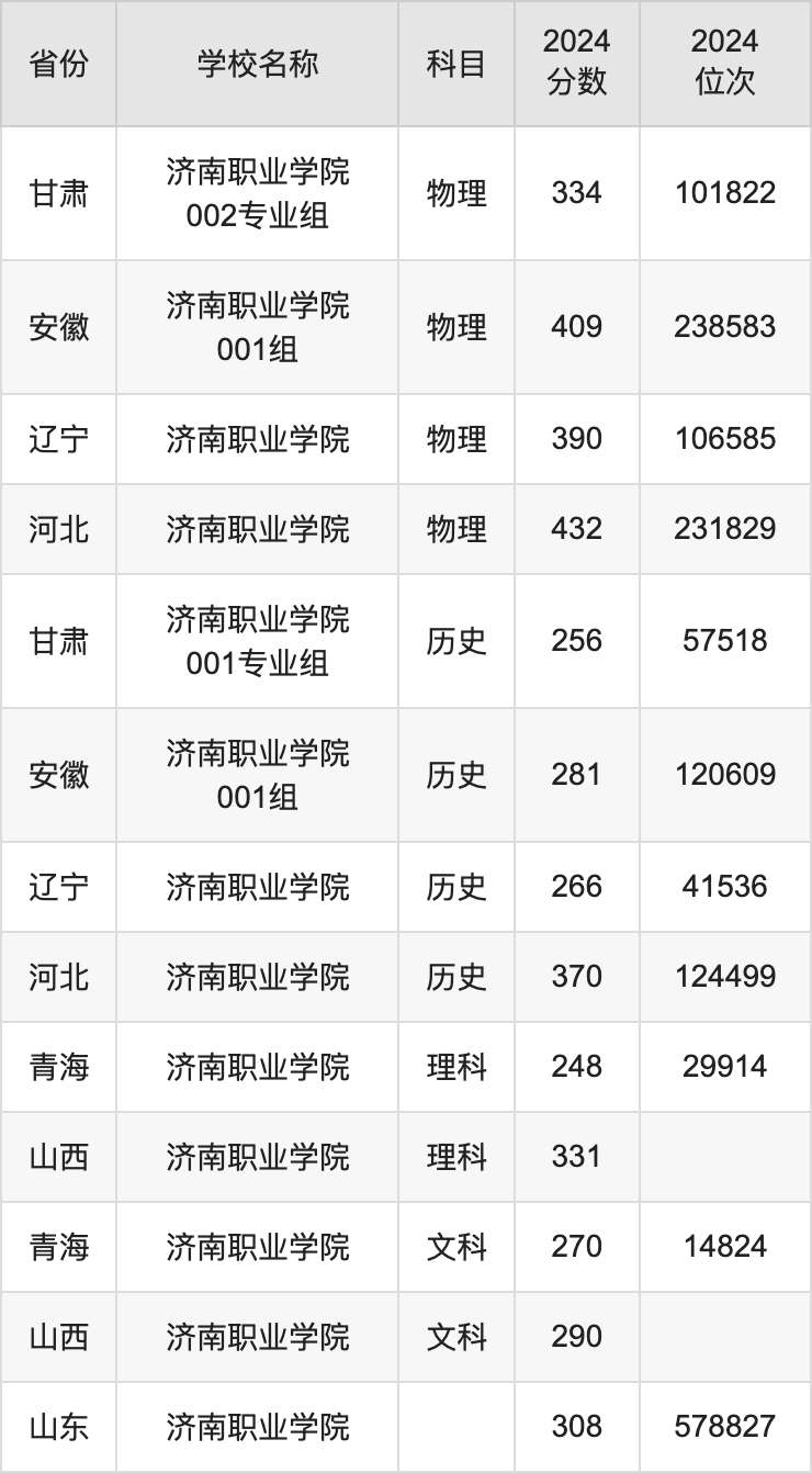 2024年济南职业学院在全国各省专科的最低录取分数线在248~432分之间。河北物理类高考生最低432分能上济南职业学院、安徽物理类高考生最低409分能上济南职业学院……下文将展示济南职业学院在全国7个高考省份中的专科最低投档录取分汇总!