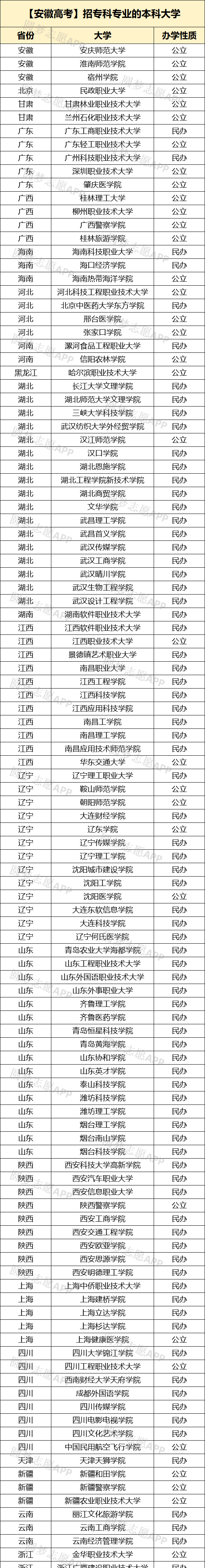在2024年安徽高考中,部分省内本科院校为考生提供了专科层次的招生,具体名单如下: