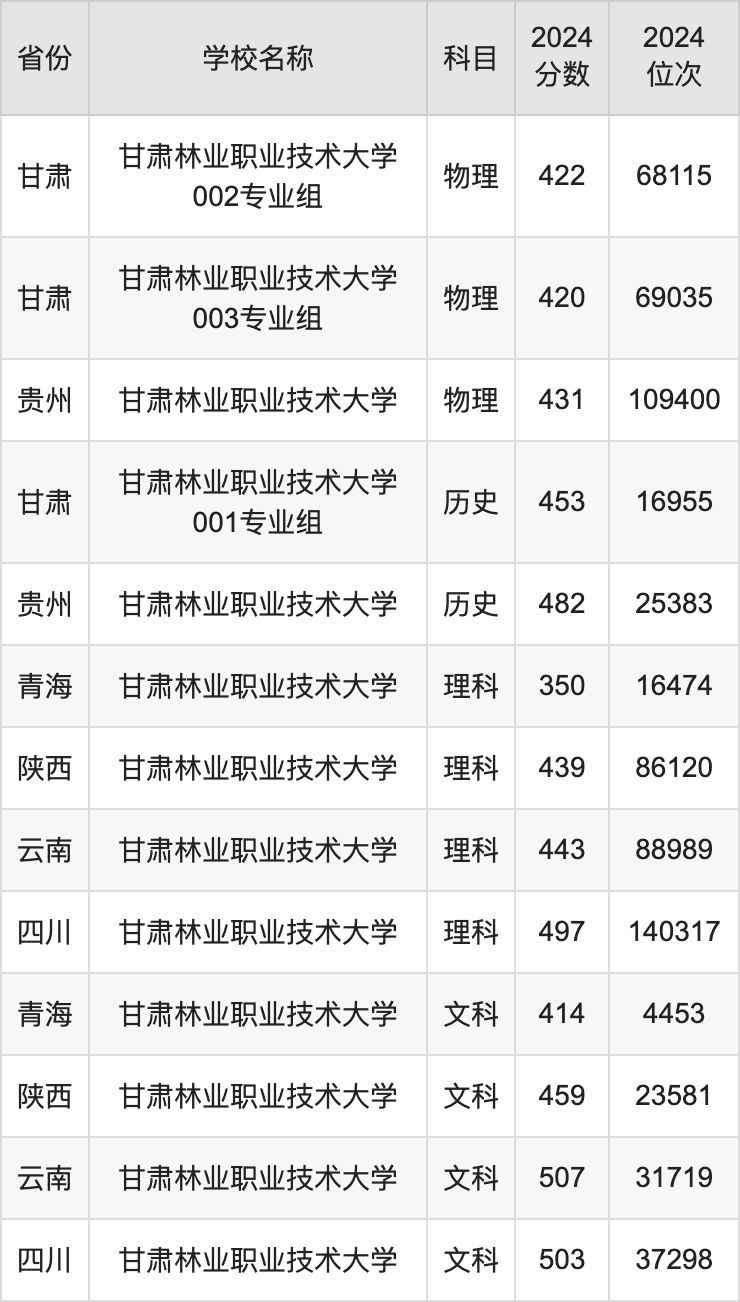 甘肃林业职业技术大学2024年有4个专业组面向甘肃省内首选了物理科目的考生招生,002组的收分最高,分数线达422分,选科要求是不限,招生专业包含设施园艺。003组的录取分数线最低,2024年为420分,选科要求是不限,招生专业包含智慧林业技术、园林工程、地理信息技术、生态环境工程技术、生态水利工程。