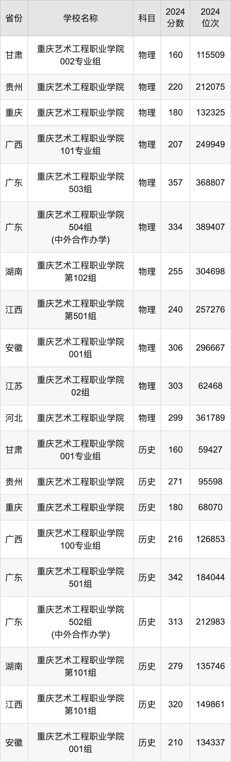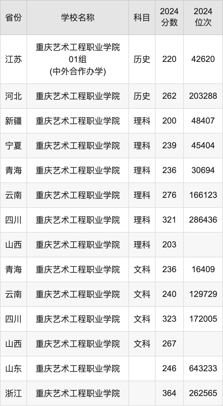 一、2024重庆艺术工程职业学院录取分数线