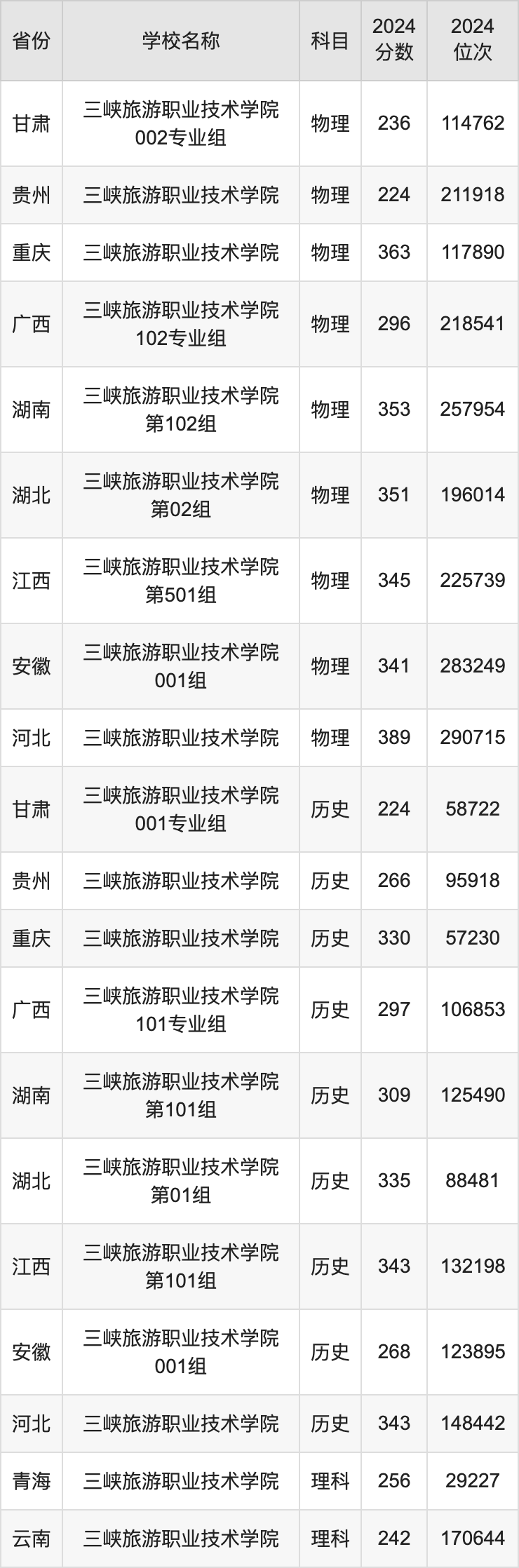 可见,三峡旅游职业技术学院的不同专业组,在“招生专业、录取分数线”等方面有较大区别。物理类专业组之间的分数线差距高达0分、历史类专业组之间的分数线差距高达0分。