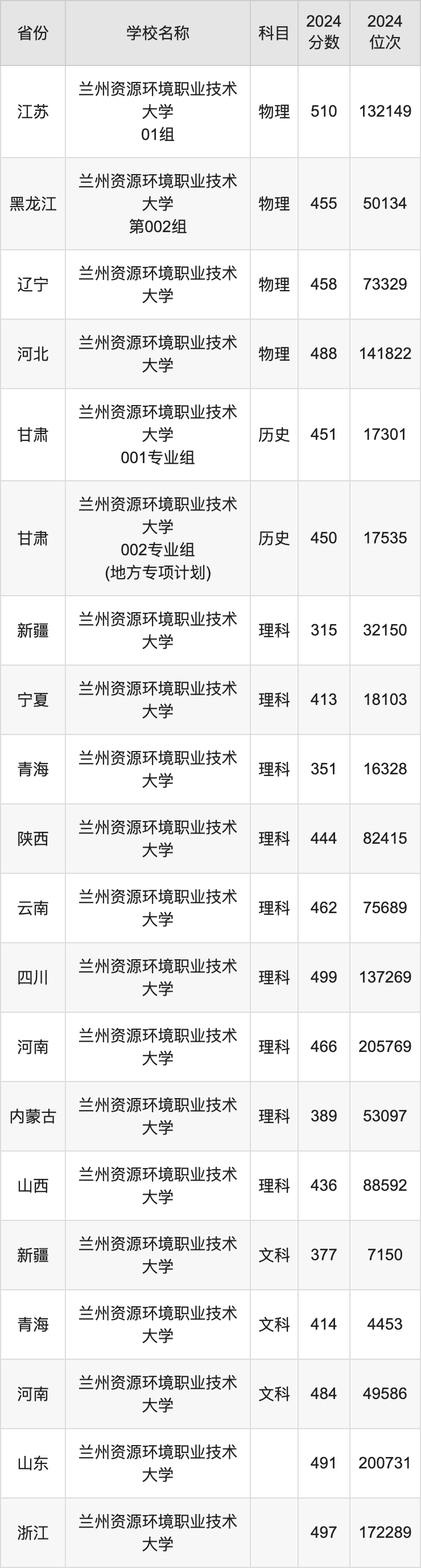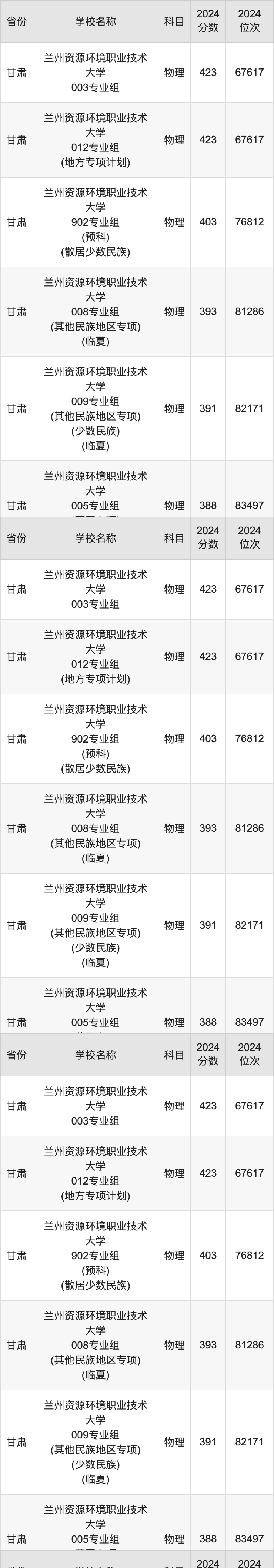 兰州资源环境职业技术大学2024年有14个专业组面向甘肃省内首选了物理科目的考生招生,003组的收分最高,分数线达423分,选科要求是不限,招生专业包含资源勘查工程技术、自动化技术与应用、智慧气象技术、安全工程技术、智能制造工程技术、环境地质工程、智能采矿技术、机器人技术、应急管理、应用化工技术。004组(藏区专项)(加试藏语文)(甘南)的录取分数线最低,2024年为357分,选科要求是不限,招生专业包含集成电路工程技术、材料化冶金应用技术、储能材料工程技术。