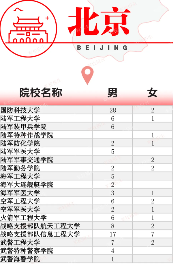 2024年在京计划招生共计135人。其中国防科技大学:男生28人,女生2人。