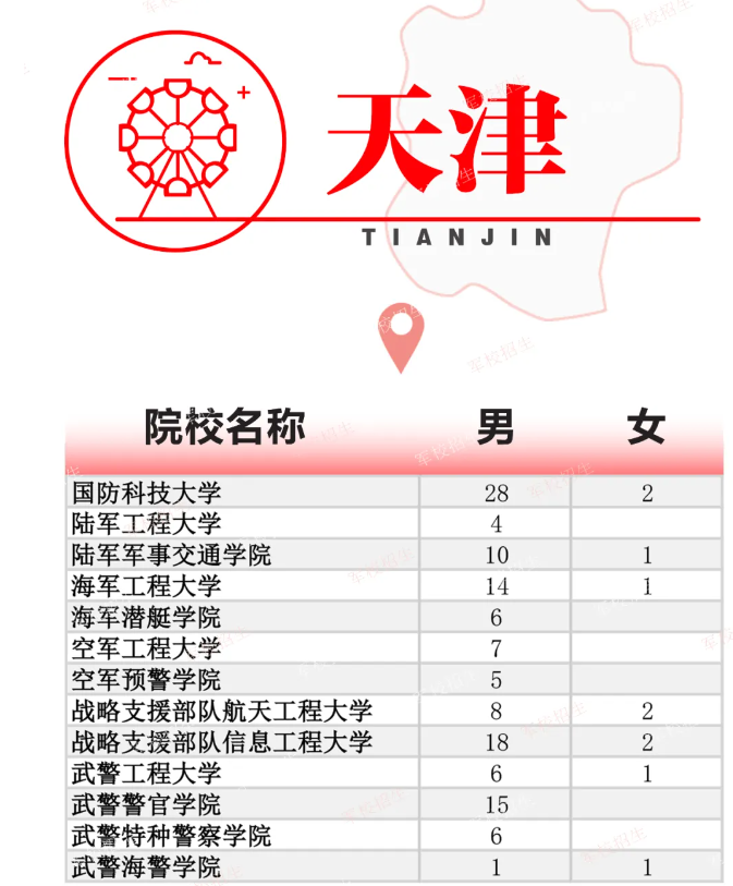 今年军队院校在天津招生共计138人,其中男生128人,女生10人。