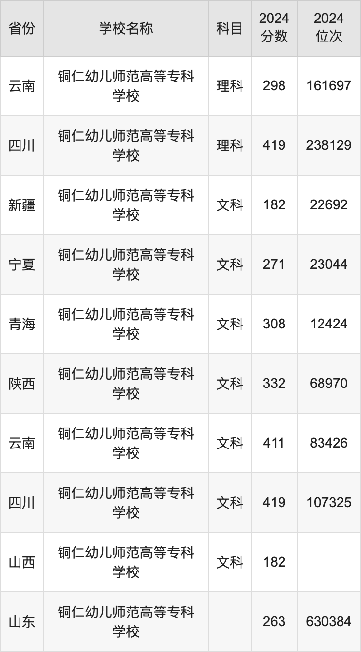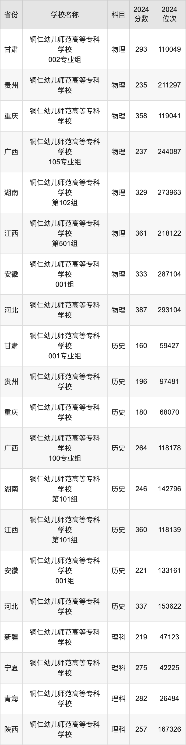 一、2024铜仁幼儿师范高等专科学校录取分数线