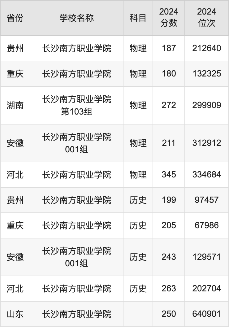 2024年长沙南方职业学院在全国各省专科的最低录取分数线在180~345分之间。河北物理类高考生最低345分能上长沙南方职业学院、湖南物理类高考生最低272分能上长沙南方职业学院……下文将展示长沙南方职业学院在全国6个高考省份中的专科最低投档录取分汇总!