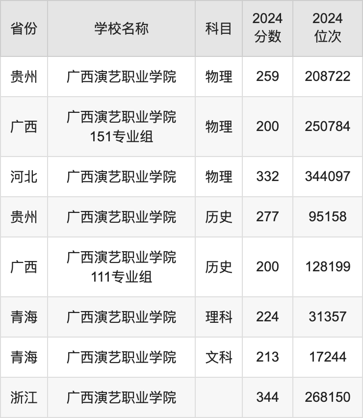 2024年广西演艺职业学院在全国各省专科的最低录取分数线在200~344分之间。浙江高考生最低344分能上广西演艺职业学院、河北物理类高考生最低332分能上广西演艺职业学院……下文将展示广西演艺职业学院在全国5个高考省份中的专科最低投档录取分汇总!