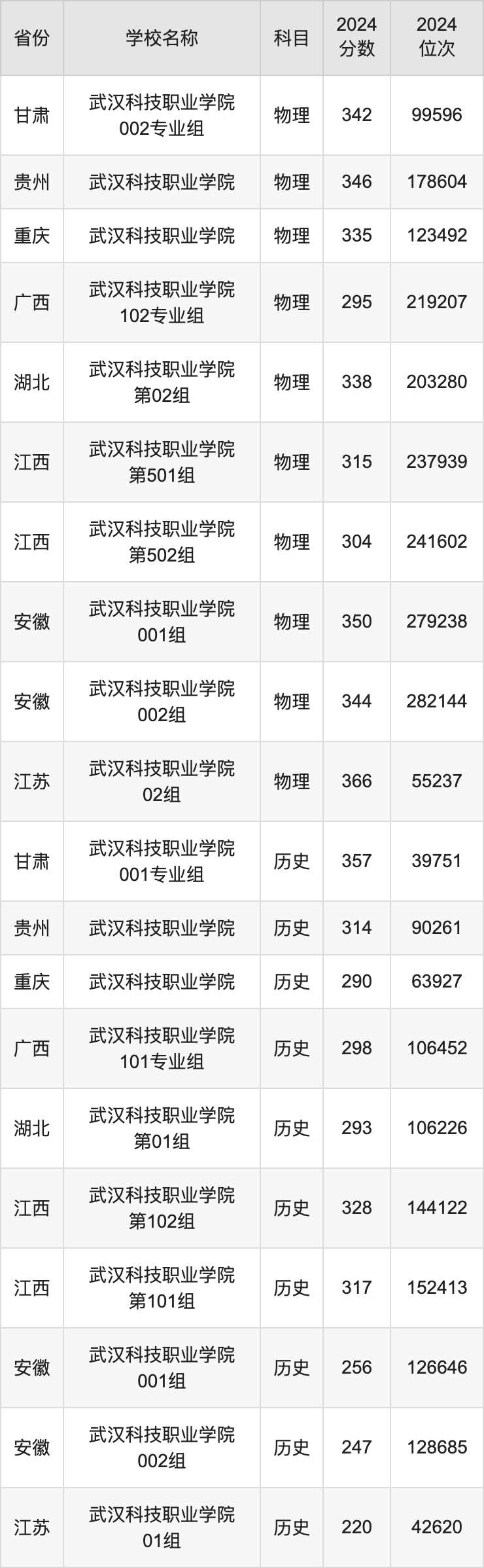 武汉科技职业学院2024年有1个专业组面向湖北省内首选了历史科目的考生招生,第01组的收分最高,分数线达293分,选科要求是不限,招生专业包含制冷与空调技术、机电一体化技术、无人机应用技术、铁道机车运用与维护、铁道交通运营管理、计算机应用技术。第01组的录取分数线最低,2024年为293分,选科要求是不限,招生专业包含制冷与空调技术、机电一体化技术、无人机应用技术、铁道机车运用与维护、铁道交通运营管理、计算机应用技术。