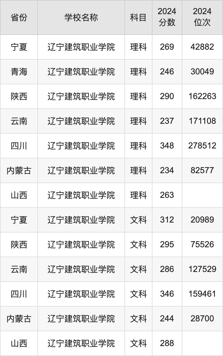 辽宁建筑职业学院2024年面向辽宁省内首选了历史科目的考生招生,分数线达196分,招生专业包含建筑室内设计、工程造价、计算机网络技术、软件技术、大数据技术、人工智能技术应用、大数据与会计、电子商务、现代物流管理、旅游管理。