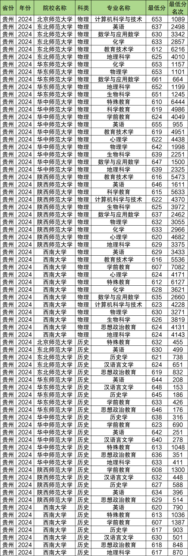 在此以贵州省为例,整理了2024年国家公费师范生在该省的录取分数线,如下。