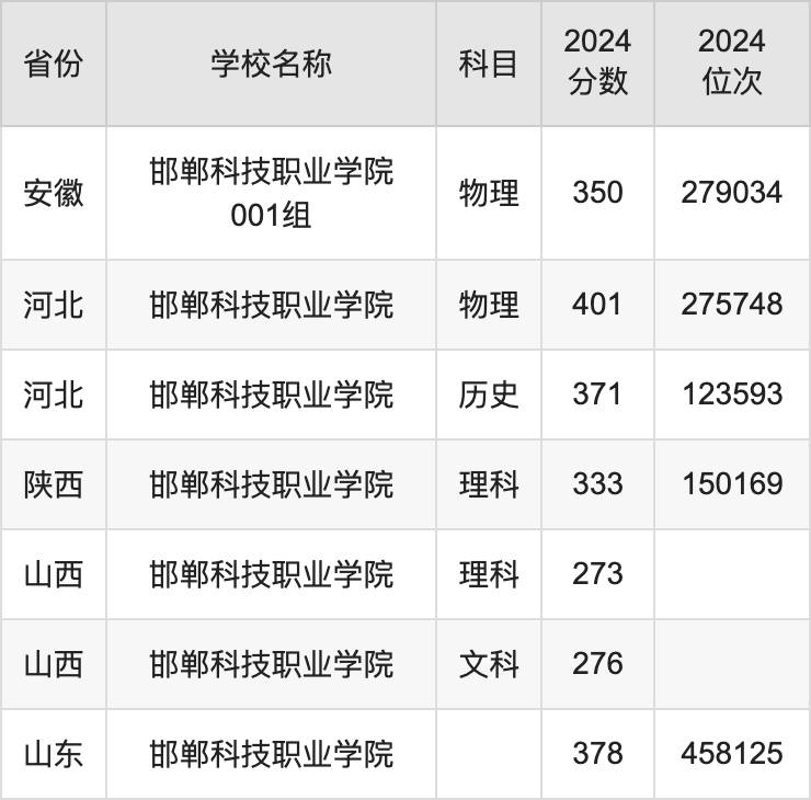 2024年邯郸科技职业学院在全国各省专科的最低录取分数线在273~401分之间。河北物理类高考生最低401分能上邯郸科技职业学院、山东高考生最低378分能上邯郸科技职业学院……下文将展示邯郸科技职业学院在全国5个高考省份中的专科最低投档录取分汇总!