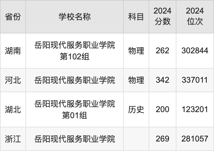 2024年岳阳现代服务职业学院在全国各省专科的最低录取分数线在200~342分之间。河北物理类高考生最低342分能上岳阳现代服务职业学院、浙江高考生最低269分能上岳阳现代服务职业学院……下文将展示岳阳现代服务职业学院在全国4个高考省份中的专科最低投档录取分汇总!