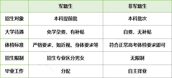 注:有些军校在提前批和本科批都有招生,但是只有通过提前批进入军校,才属于军籍生,享受军人待遇,且在校期间一切学习生活费用全免,毕业后工作由学校根据专业和各大军区需要分配。而通过本科批次录取的学生,属于非军籍学生,不享受分配、学杂费全面等待遇。