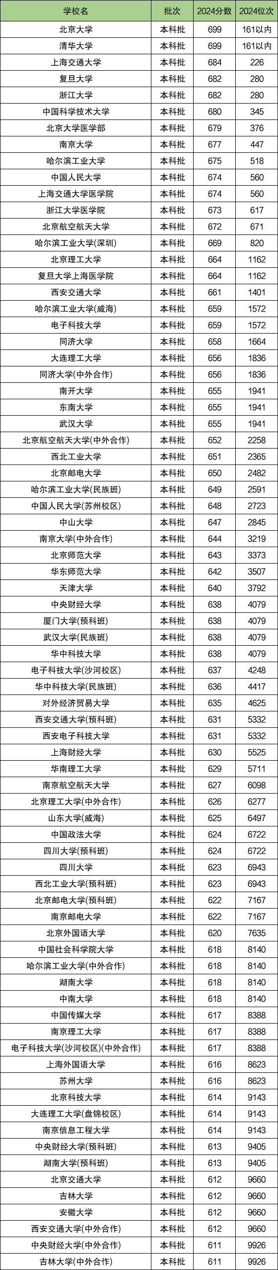 根据国内各大学在重庆市物理类的招生分数可知,重庆市高考成绩在1万名之前的物理考生能上的学校有76所,对应的分数为699分~611分。