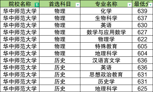 2、华中师范大学最低分:历史组625分、物理组604分。