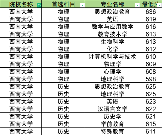 思想政治教育625分、汉语言文学628分、学前教育616分、历史学628分。