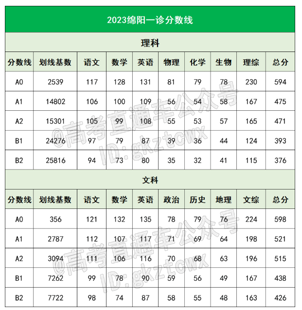 理科:A0线为594分、A1线为475分、A2线为471分、B1线为393分、B2线为376分;