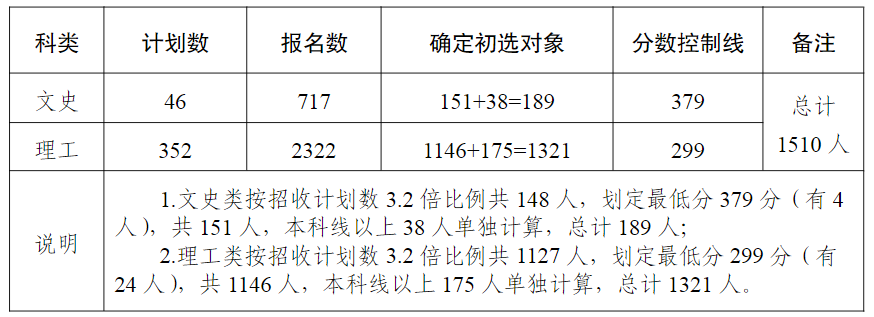 体检控制分数线:文科男生382分,文科女生454分,理科男生383分,理科女生456分。