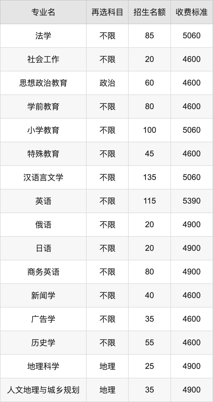 石家庄学院在历史组本科批招生的各个专业,每年的学费是4600元-5390元。招生人数最多的专业是汉语言文学,2024年招135人,学费是5060元。