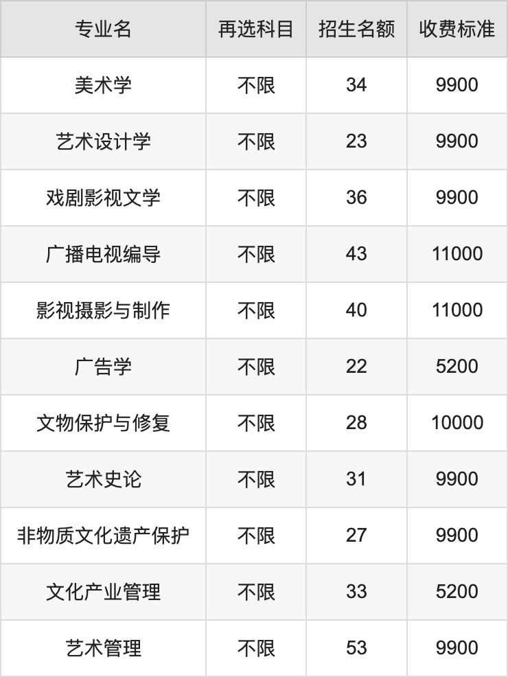 南京艺术学院在历史组本科批招生的各个专业,每年的学费是5200元-11000元。招生人数最多的专业是艺术管理,2024年招53人,学费是9900元。