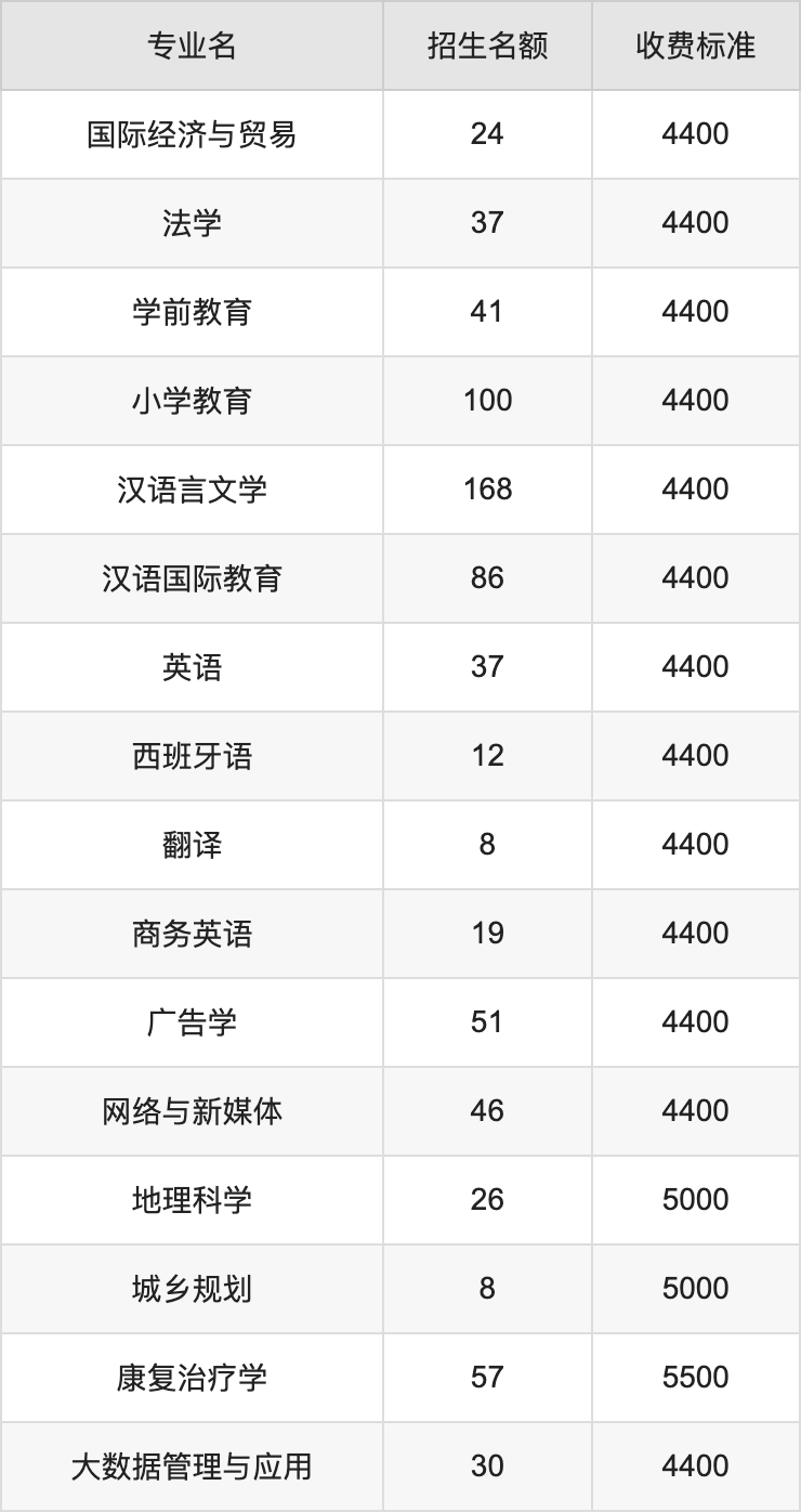 平顶山学院在文科本科二批招生的各个专业,每年的学费是4400元-5500元。招生人数最多的专业是汉语言文学,2024年招168人,学费是4400元。