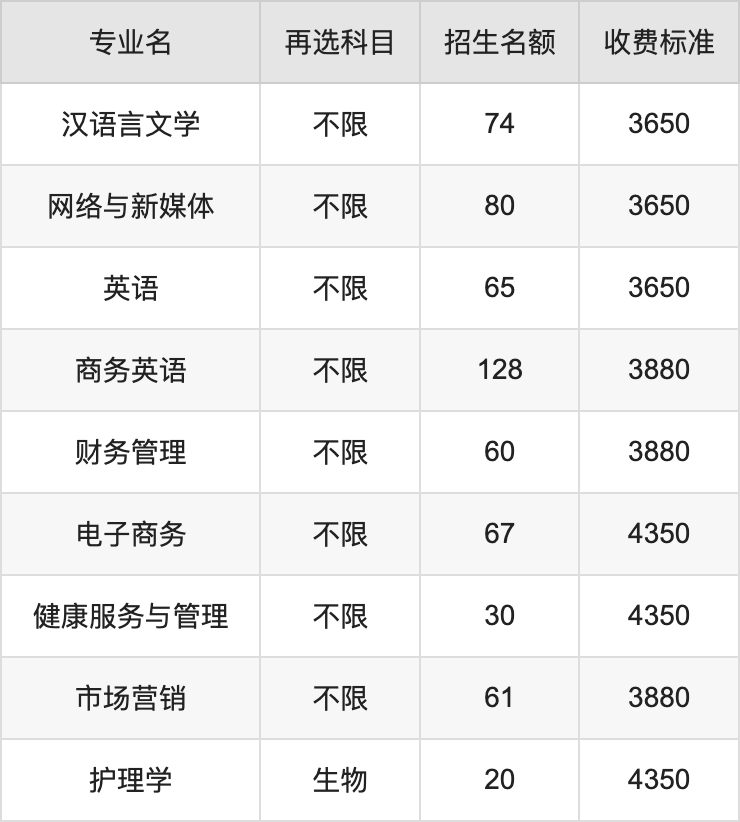 新余学院在历史组本科批招生的各个专业,每年的学费是3650元-4350元。招生人数最多的专业是商务英语,2024年招128人,学费是3880元。