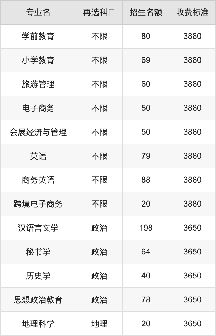 南昌师范学院在历史组本科批招生的各个专业,每年的学费是3650元-3880元。招生人数最多的专业是汉语言文学,2024年招198人,学费是3650元。