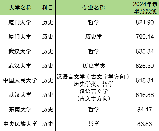 2024年江苏历史类强基计划厦门大学的哲学专业,录取分数线为821.9分;武汉大学的历史学类专业,录取分数线为626.59分。