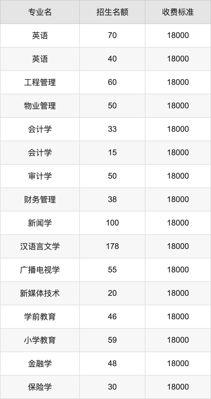 内蒙古鸿德文理学院在文科本科二批招生的各个专业,每年的学费是18000元-21000元。招生人数最多的专业是汉语言文学,2024年招178人,学费是18000元。