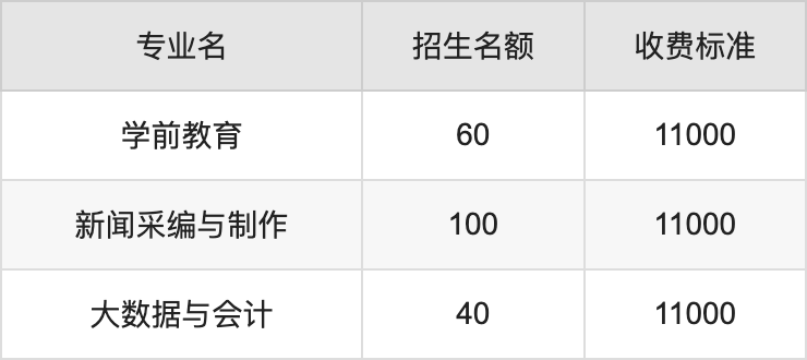 内蒙古鸿德文理学院在文科高职高专批招生的各个专业,每年的学费是11000元。招生人数最多的专业是新闻采编与制作,2024年招100人,学费是11000元。