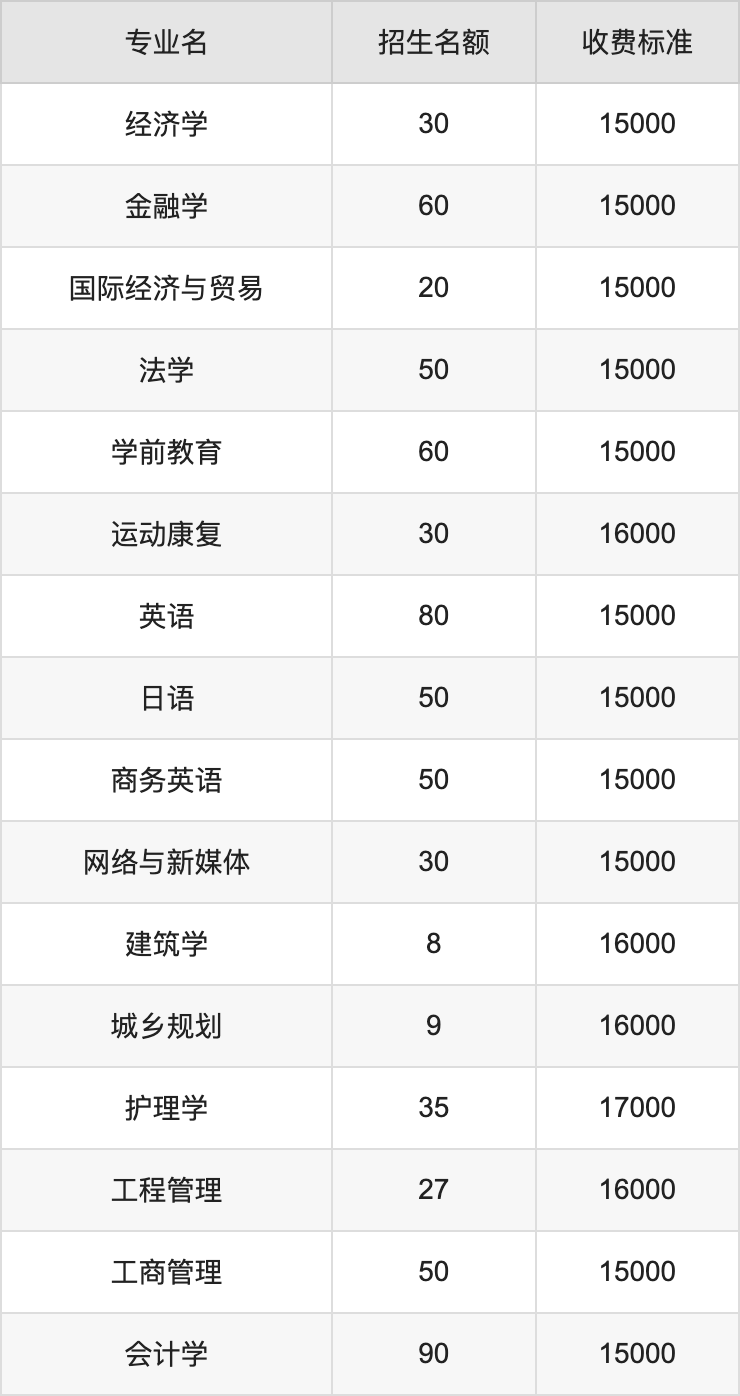 黄河科技学院在文科本科二批招生的各个专业,每年的学费是15000元-17000元。招生人数最多的专业是会计学,2024年招90人,学费是15000元。